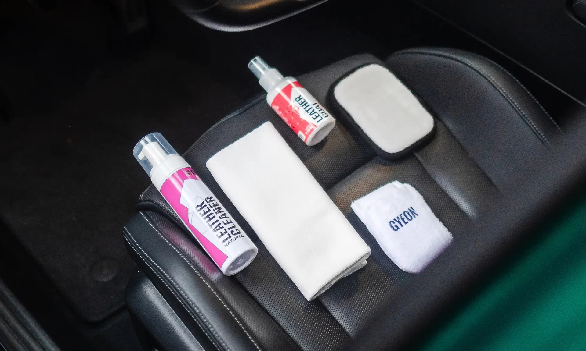LeatherCleaner Natural, LeatherCoat REDEFINED and application accessories.